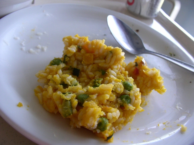 Rýži uvaříme v osolené vodě. V kastrůlku rozehřejeme olej, opražíme cibuli a osmahneme kousky vařeného masa, následně přidáme žampiony a hrášek. Do směsi vmícháme uvařenou rýži, podlijeme vývarem z polévkové kostky. Do směsi přimícháme dvě lžičky kečupu, lžící hořčice a worcesterské omáčky a po špetkách dochutíme kořením. Dobře promícháme a servírujeme. Na talíři dozdobíme strouhaným sýrem a petrželkou.